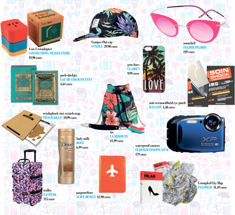 Coole prints en een vleugje retro. Zomergadgets ontsnappen niet aan deze alomtegenwoordige trend. Nood aan een opkikker? In de parfumwereld is de klassieke Eau de cologne weer helemaal terug van weggeweest. De weg kwijt? Doe beroep op de crumpled city maps: superhandig, slechts 20 gram licht en waterdicht. Deze onverwoestbare kaart frommel je zonder stress tussen je zonnecrème, je beachproof fototoestel en de rest van je trendy zomerspullen. En met een baby als accessoire bekijk je het leven door een roze bril dankzij de draaibare Maxi-Cosi. Vergeet je reisadapter en je muggenspray niet!