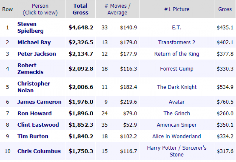 Spielberg laat Michael Bay en Peter Jackson achter op een gedeelde tweede plaats. Ze zijn elk goed voor 6,5 miljard dollar (5,3 miljard euro). George Lucas valt dan weer net uit de top tien. De volledige lijst vind je hier.