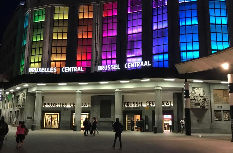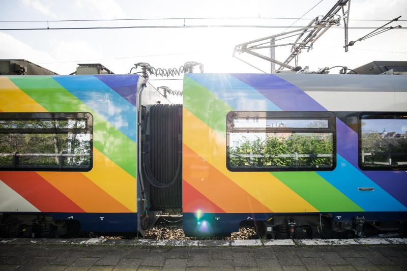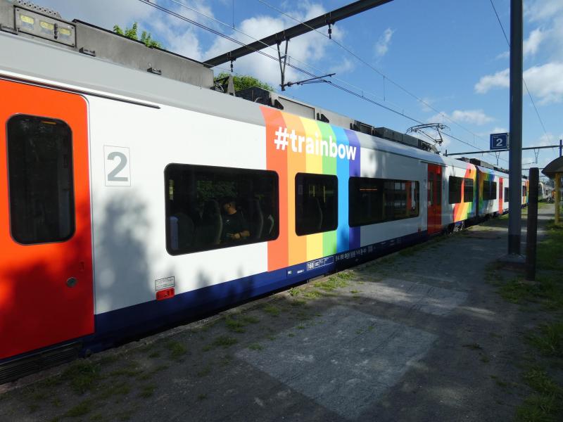Het is de eerste keer dat NMBS een regenboogtrein inzet. Daarnaast zijn verschillende stationsgebouwen deze week getooid met regenboogvlaggen.
