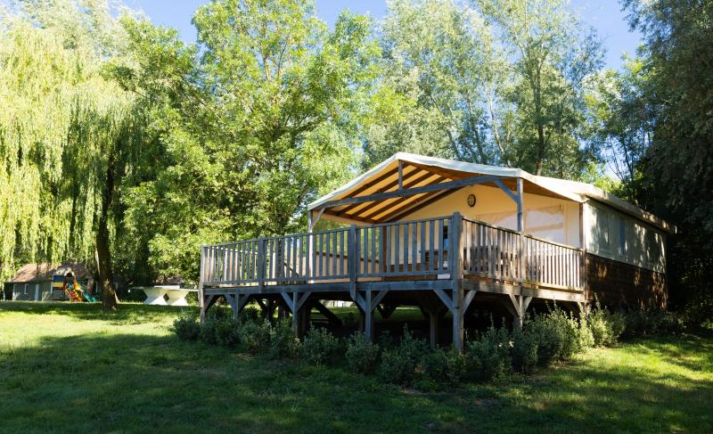 Deze camping aan de Loir herbergt één ecolodge. Je gaat hier back to basic, maar hebt wel comfort zoals een echt bed, douche, keukentje en zelfs je eigen verhoogde terras. Groot pluspunt: het zwembad met zicht op de kerktoren!