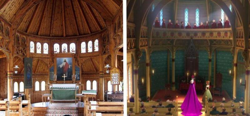 De kapel van St. Olaf’s Church in Noorwegen lijkt sprekend op de kapel in de film Frozen. De kerk staat in het Noorse Balestrand en werd gebouwd door de Engelse Margaret Green, de vrouw van de Noorse Knut Kvikne. De kapel vormt een belangrijk deel in het verhaal over de twee zusjes, de liefde en natuurlijk Olaf de sneeuwpop (mogelijks is zijn naam ook op de kerk geïnspireerd?).
