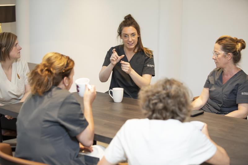 Goede zorg bieden doe je niet alleen. Ik werk samen met collega’s die elk hun specifiek werkdomein hebben. Elke dag hebben wij samen een kort overleg over de toestand van de bewoners op onze afdeling. Als er bepaalde bewoners extra zorg nodig hebben, bespreken we samen de noden.