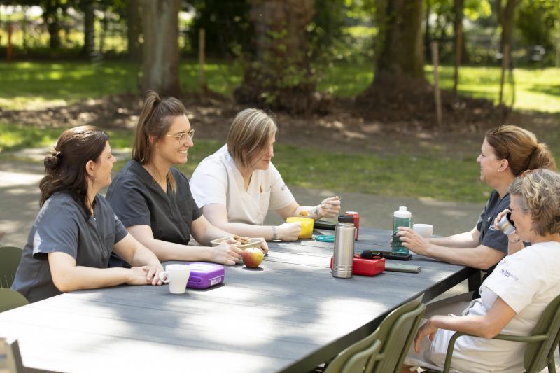 Tijd voor een lekkere lunch. Ik geniet van dit moment samen met mijn collega’s. Vaak lachen we heel wat af. Bij mooi weer eten we op het terras en genieten we van de zon en het mooie uitzicht op de tuin.