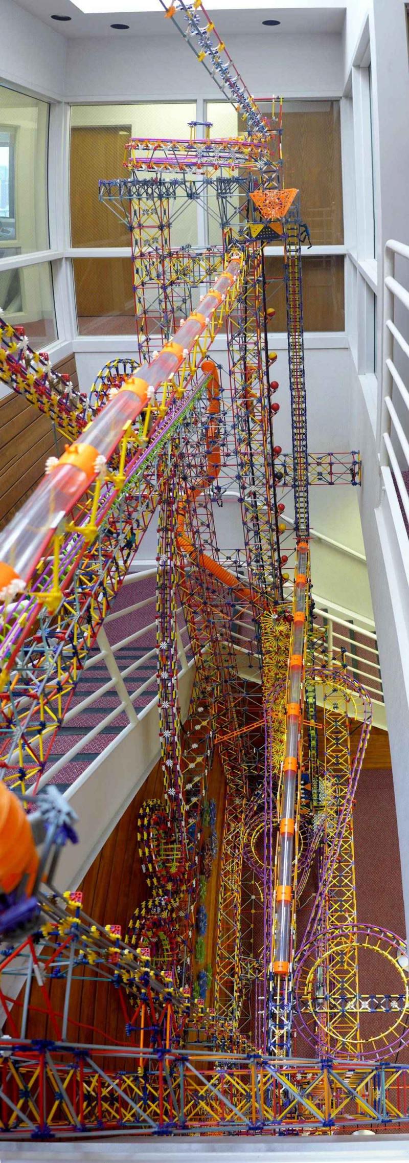 Een werkje voor mensen met engelengeduld. Dit is de grootste knikkerk'nexbaan ter wereld. Een knikkerbaan gemaakt van K'nex dus.