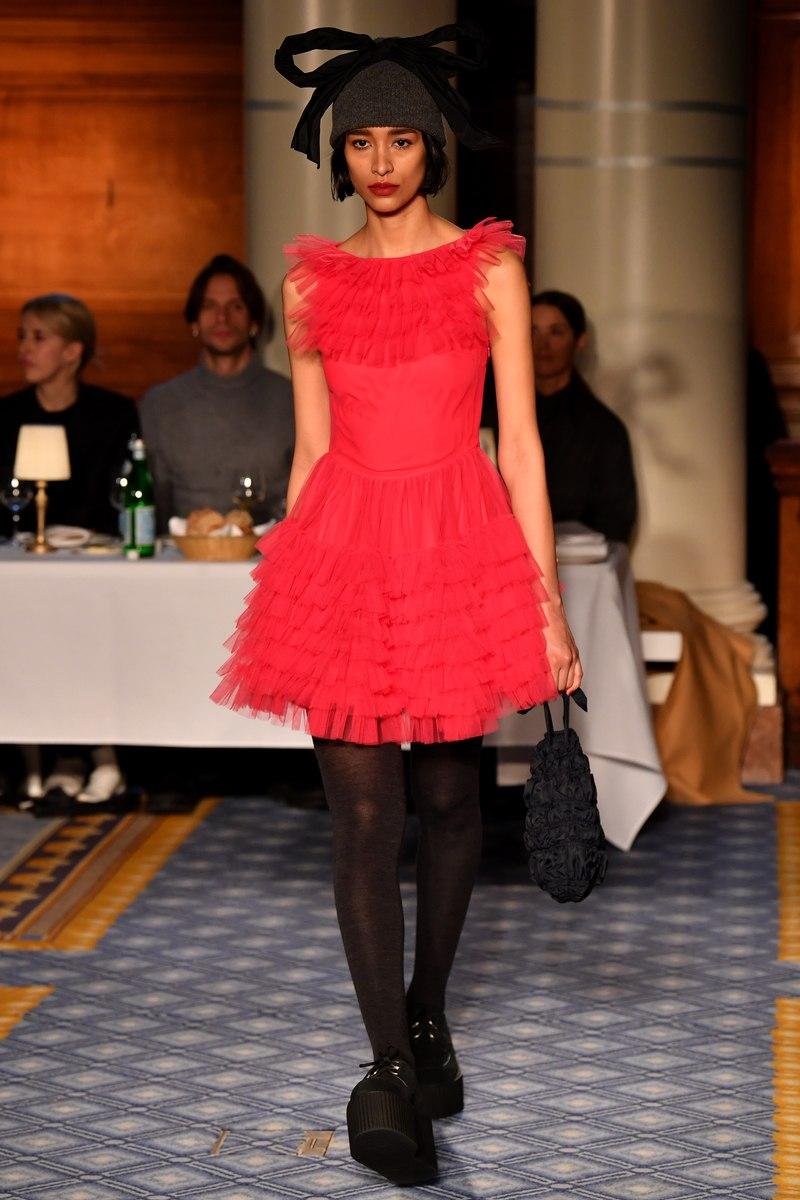 Op haar 31ste liet de Britse Molly Goddard zich inspireren door haar jeugd en de vintage markten van Londen, nadat ze een foto van haar vader en zichzelf als klein meisje had teruggevonden. Net als in de wirwar van kraampjes worden genres gemixt. Jurken en jupons worden gedragen met mohair sweaters. Kanariegeel, koningsblauw, roze en rood door elkaar een explosie van kleuren.