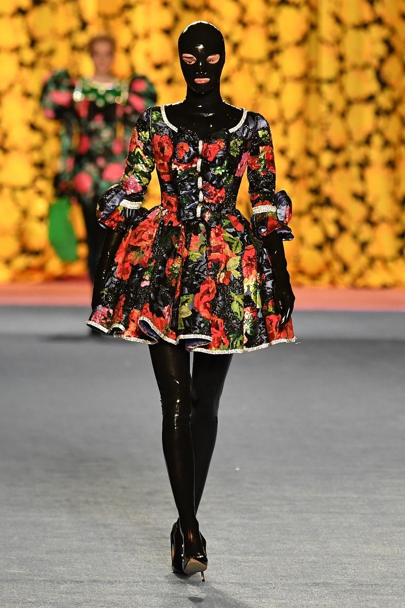 De rijzende ster van de Britse mode Richard Quinn heeft Londen verblind met een flinke dosis glamour. Jurken met slepen en bloemen, broeken bezet met parels en kristallen tot zelfs op de kappen die de gezichten van zijn modellen volledig bedekten. Een hulde aan de pearlies.