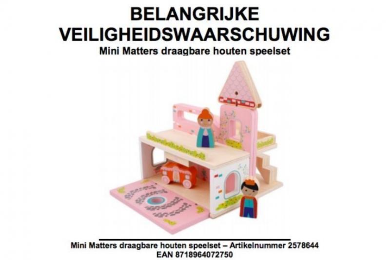Non-food-discountwinkelketen Action heeft een veiligheidswaarschuwing geplaatst bij een draagbare houten speelset van het merk Mini Matters. Het gaat om een roze kasteel met twee poppetjes en een koets. "De balustrade van het kasteel kan loskomen met een kracht die onder de wettelijke eis ligt. Daardoor kan een klein onderdeel loskomen waarin jonge kinderen kunnen stikken", klinkt het.