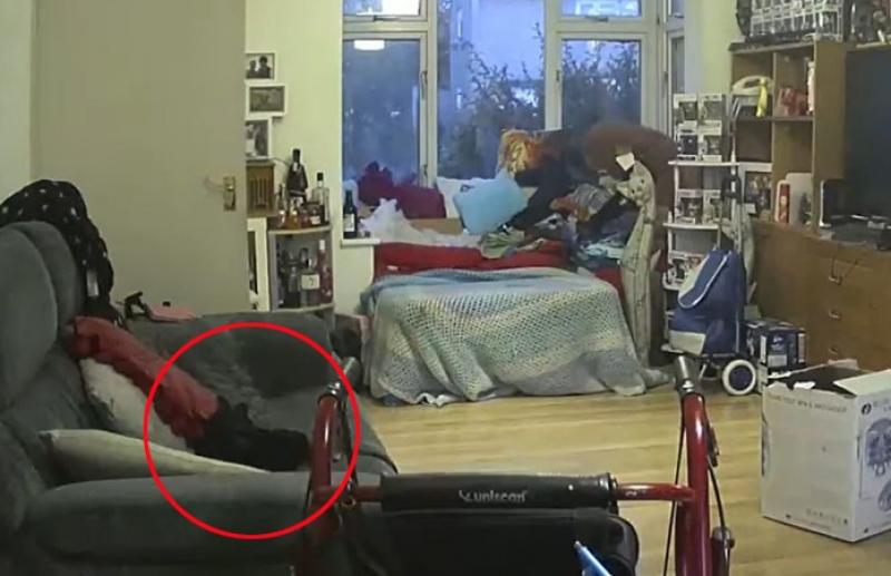 De vrouw deed haar verhaal op Reddit. Op 24 mei, precies een jaar nadat haar zwarte kat Blackjack overleed, filmde haar beveiligingscamera iets heel vreemds. Je ziet hoe haar andere kat naar de gang loopt, maar plots duikt er een silhouet op in de zetel. Wanneer de vrouw het licht aansteekt, is het zwarte ding' nog duidelijker te zien.