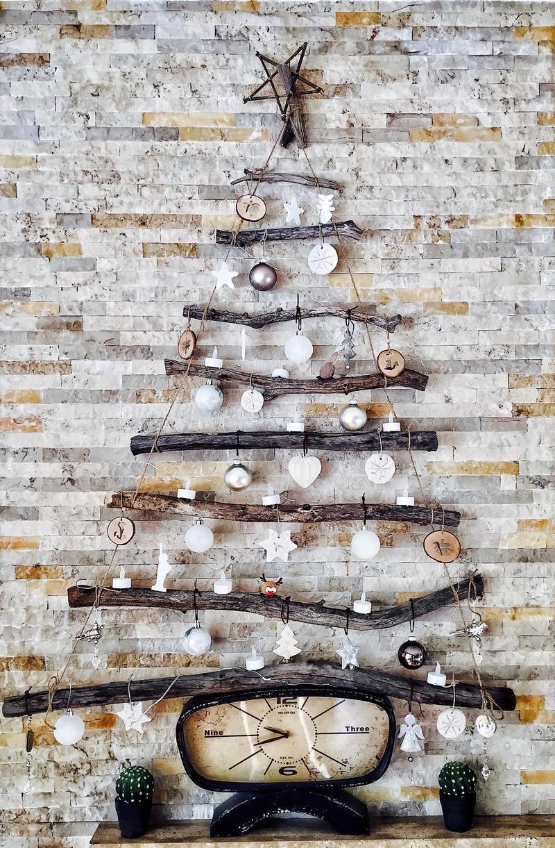 Met een minimum aan DIY-talent hang je makkelijk een paar kersttakken en decoratie aan de muur. Dode takken zijn daar perfect voor. Hou je van dennengeur? Gebruik dan wat takken van een echte spar, voor een heerlijk parfum in huis.