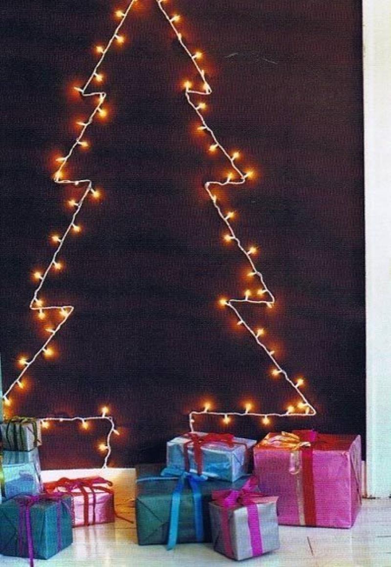 Het is niet omdat je een mooie kerstslinger hebt, dat je moet investeren in een dennenboom. Je kan hem ook gewoon tegen de muur hangen, in de vorm van een boom. Het voordeel is dat je achteraf geen naalden moet opkuisen.