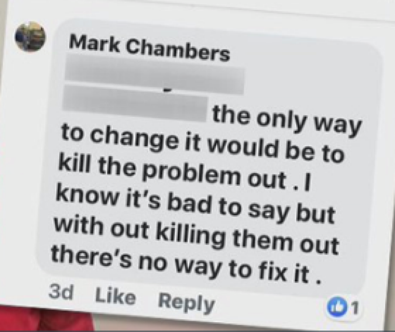 "De enige manier om hier verandering in te brengen, is het probleem uit de weg ruimen", vervolgde Chambers. "Ik weet dat het slecht is wat ik zeg, maar als je hen niet uitroeit, kun je dit niet oplossen." Toen Chambers door nieuwszender WBRC werd geconfronteerd met zijn uitspraken, ontkende hij dit.