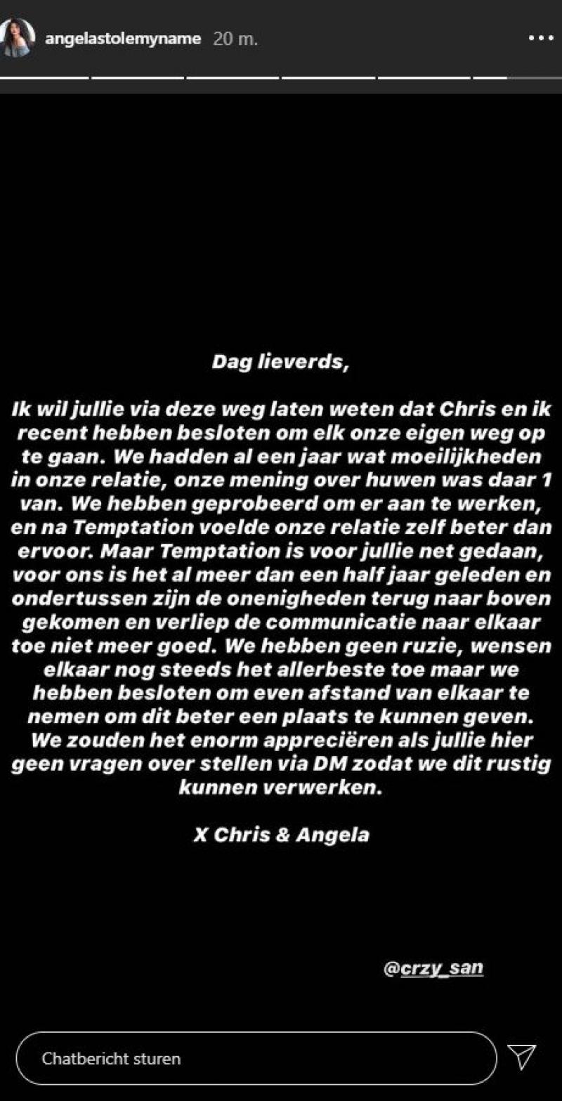 Angela kondigde op Instagram aan dat het over & out is tussen hen. Ik wil jullie via deze weg laten weten dat Chris en ik recent hebben besloten om elk onze eigen weg op te gaan. We hadden al een jaar wat moeilijkheden in onze relatie. Onze mening over huwen was daar één van. We hebben geprobeerd om eraan te werken en na Temptation' voelde onze relatie zelfs beter dan ervoor. Maar Temptation' is voor jullie net gedaan, voor ons is het al meer dan een half jaar geleden en ondertussen zijn de onenigheden terug naar boven gekomen en verliep de communicatie naar elkaar toe niet meer goed. We hebben geen ruzie, we wensen elkaar nog steeds het allerbeste toe, maar we hebben besloten om even afstand van elkaar te nemen om dit beter een plaats te kunnen geven, klinkt het.