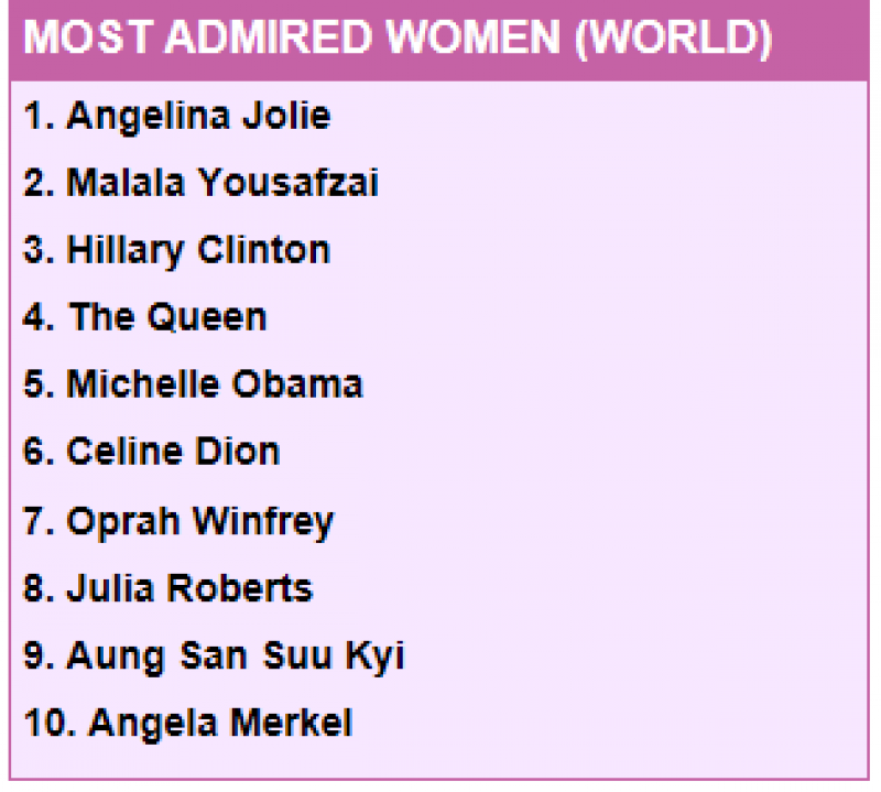 De 39-jarige Jolie is net klaar met het regisseren van Unbroken, een veelgeprezen film over de Tweede Wereldoorlog, en bezoekt al sinds 2011 oorlogsgebieden in de hele wereld. Op de tweede plaats kwam Malala Yousafzai te staan. Het 17-jarige Pakistaanse schoolmeisje die de aanslag door de Taliban overleefde, won de Nobelprijs voor de Vrede dit jaar. De jongste Nobelprijswinnaar is een pleitbezorger voor het onderwijs en de vrouwenrechten in haar geboorteland Pakistan. Ze blogt daar al over sinds ze 11 jaar oud is. Hilary Clinton, de voormalig Amerikaanse minister van Buitenlandse Zaken, vervolledigde de top 3.