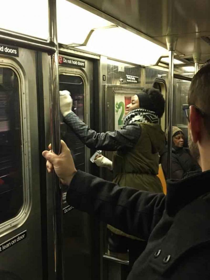 In de metro is het ijzig stil tot een man rechtstaat. Hij verbreekt de stilte en zegt dat hij doekjes en antibacteriële gel nodig heeft, want hij wil de hakenkruizen en de racistische teksten bannen. Gregory Locke beschrijft in zijn post dat hij nog nooit zoveel mensen tegelijk naar handgel zag zoeken. In welgeteld twee minuten waren alle tags weggeschrobt.