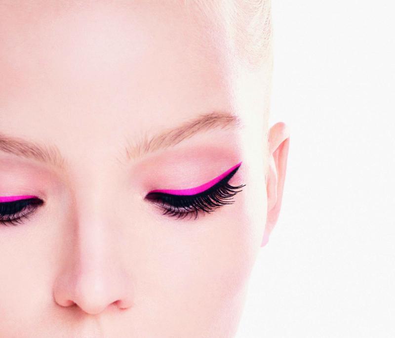 Een trand van deze zomer die zich doorzet: een dubbe lijntje waarbij je zwart combineert met een flashy kleur. Ook hier gaat alle aandacht naar je ogen. De rest van je make-up blijft zacht, met een lichte teint en zachtroze glans op je lippen.