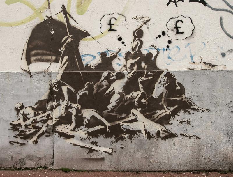 Elders in Calais maakte hij een muurschildering van vluchtelingen op een wrakkig vlot met de tekst 'We zitten niet allemaal in hetzelfde schuitje'. Het werk verwijst naar het beroemde schilderij 'Het vlot van de Medusa' van de Fransman Théodore Géricault, dat in het Louvre in Parijs hangt.