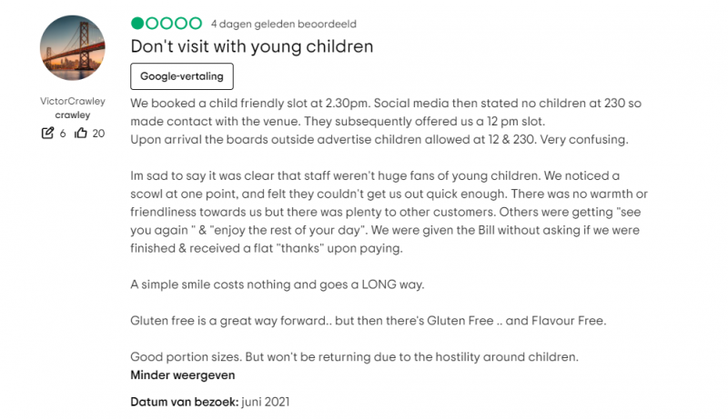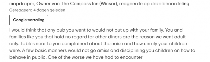 De familie die betrokken was bij het incident heeft een één ster recensie achtergelaten op TripAdvisor: «Het spijt me te zeggen dat het duidelijk was dat het personeel geen grote fan is van jonge kinderen. Ze waren niet warm of vriendelijk tegen ons, maar wel tegen anderen. Een simpele glimlach kost je niks.»