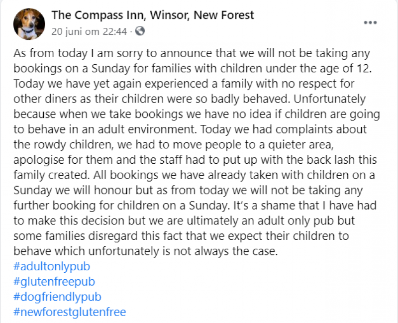 Op Facebook kondigde de caféuitbaatster aan dat vanaf nu kinderen ook op zondag niet meer welkom zijn: «Het is ontzettend jammer dat ik deze beslissing heb moeten nemen, maar we zijn tenslotte een adult only pub.»