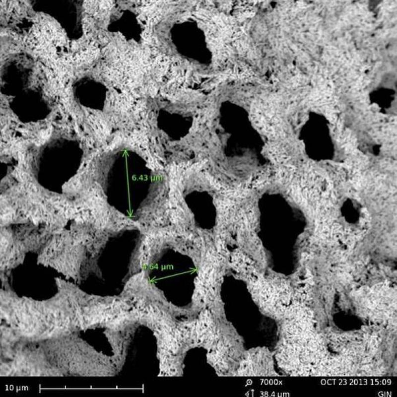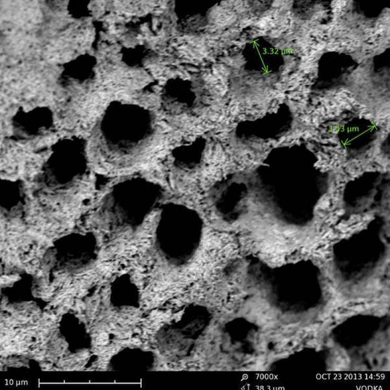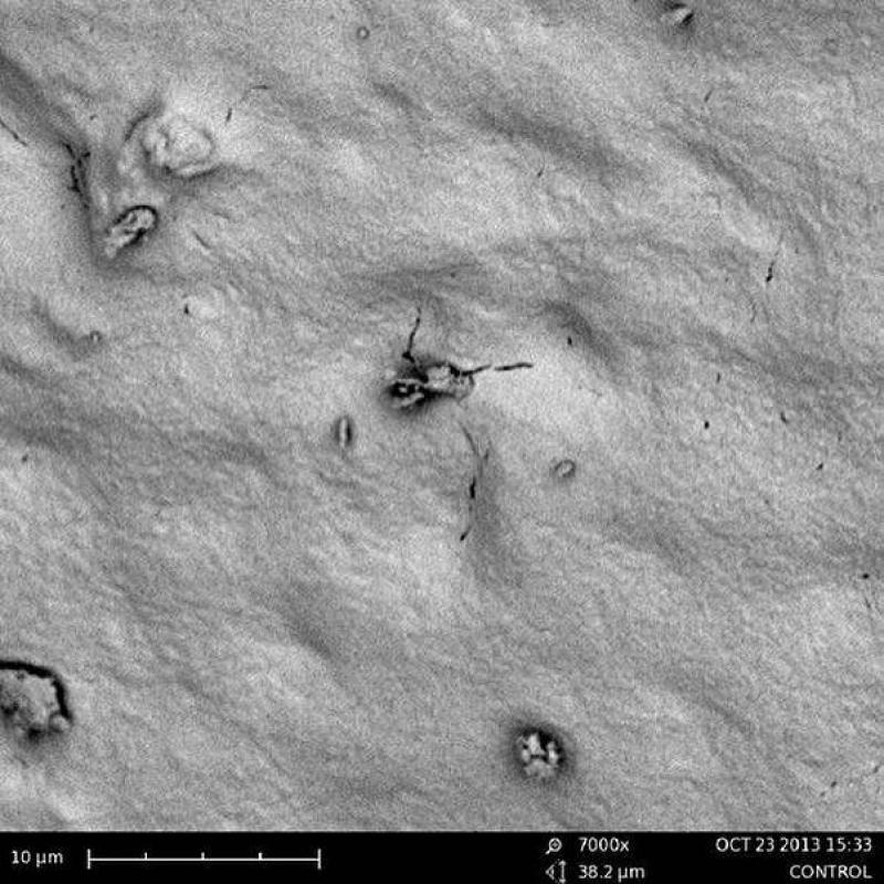 De volgende foto toont het tandoppervlak na het drinken van een suikervrije wodka cruiser. Dat drankje heeft een pH-balans van 3.2. "Er zijn meer gaten te zien dan in een Zwitsere kaas."