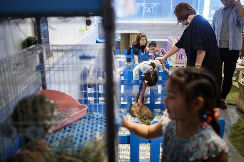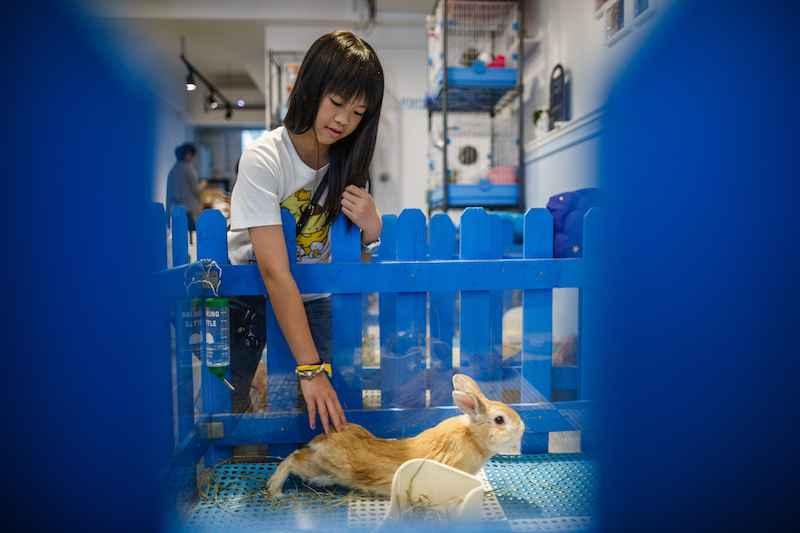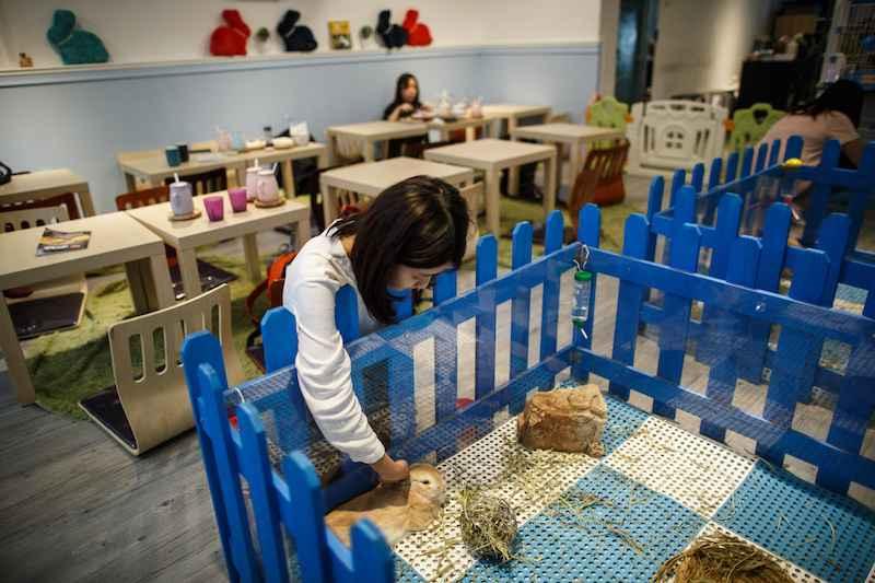 Terwijl klanten van hun thee of koffie slurpen, kunnen ze zich vergapen aan twaalf pluizige viervoeters. In tegenstelling tot bij de bars met katten, gelden in 'Rabbitland' heel wat strenge regels. Zo mogen mensen de konijnen niet knuffelen of prutsen aan hun oren, kijken en aaien is wel toegestaan. Wie een coup de foudre heeft, mag het diertje adopteren en meenemen naar huis.