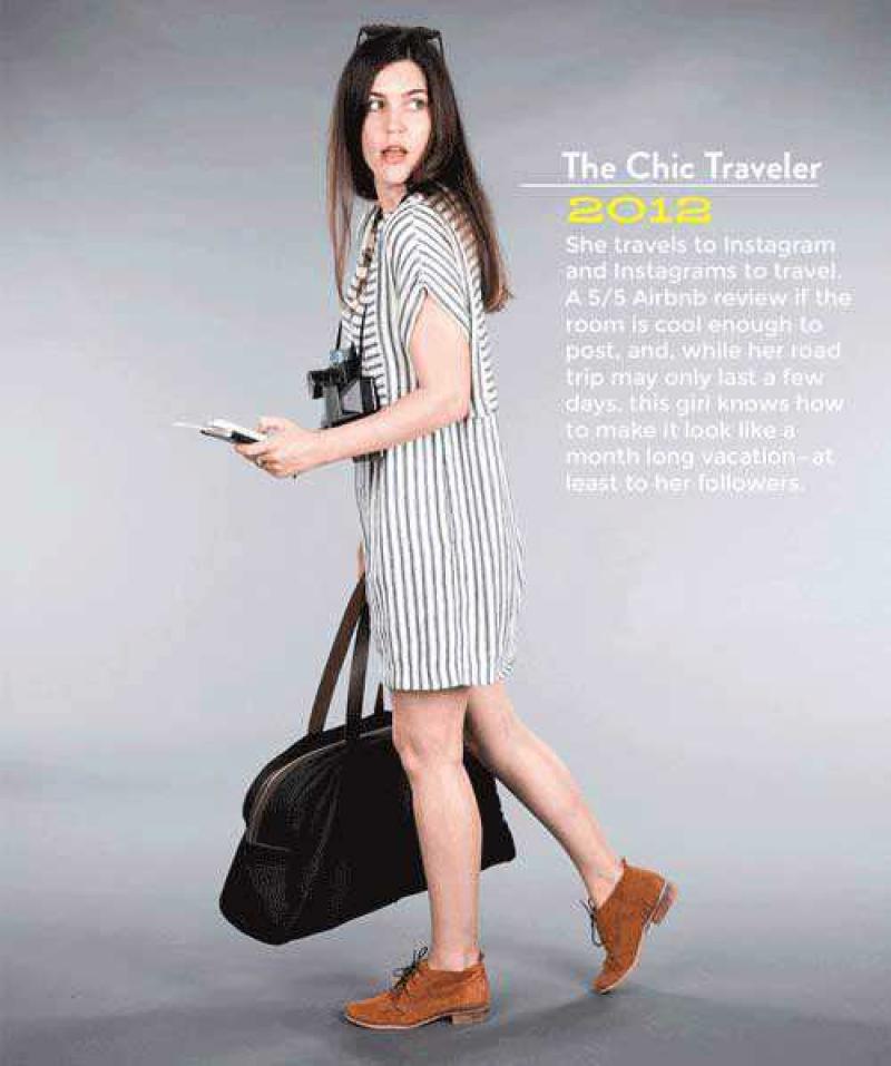 De Chic Traveller' is de volgende hipster in het rijtje. Het jaar 2012 draaide helemaal rond zweverige Instagram-foto's en romantische roadtrips, voordat de flowerpower girl opdook in 2013. Zij onderscheidt zich van de rest met grafische tattoos, een waslijst aan bezochte festivals en kleurrijke bloemenkransen.