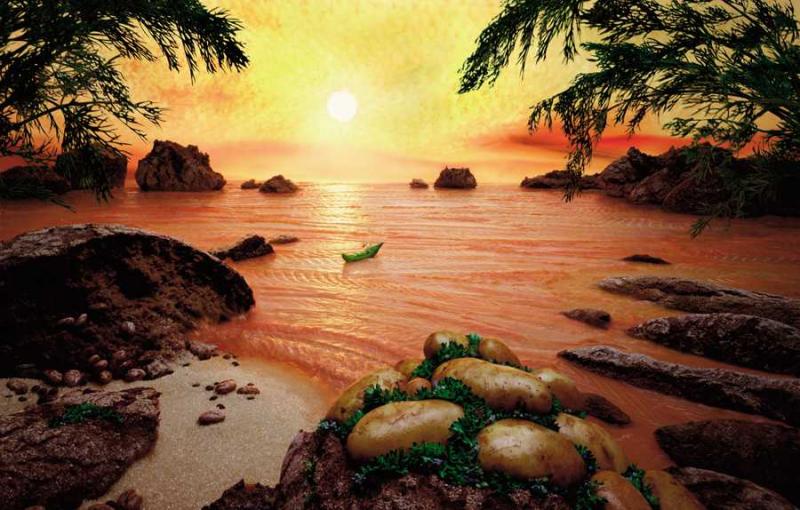 Terwijl spelen met eten voor menig man gelijk staat aan een oorvijg, ziet de Britse fotograaf Carl Warner het als een mogelijkheid om prachtige landschappen mee te creëren. Foodscapes, noemt hij de afbeeldingen. En elk detail - tot de blaadjes in de bomen, de gondel op het water en de roze lucht in de achtergrond toe - zijn gemaakt van groenten, fruit, brood, vlees en vis. 'Mushroom Savanna' was zijn eerste werk en kwam spontaan van de grond. Ondertussen worden alle taferelen zorgvuldig gepland en gefotografeerd. En telkens is het eindresultaat de moeite waard.