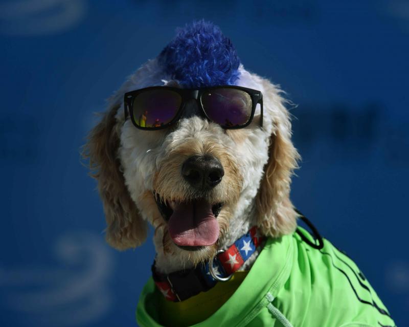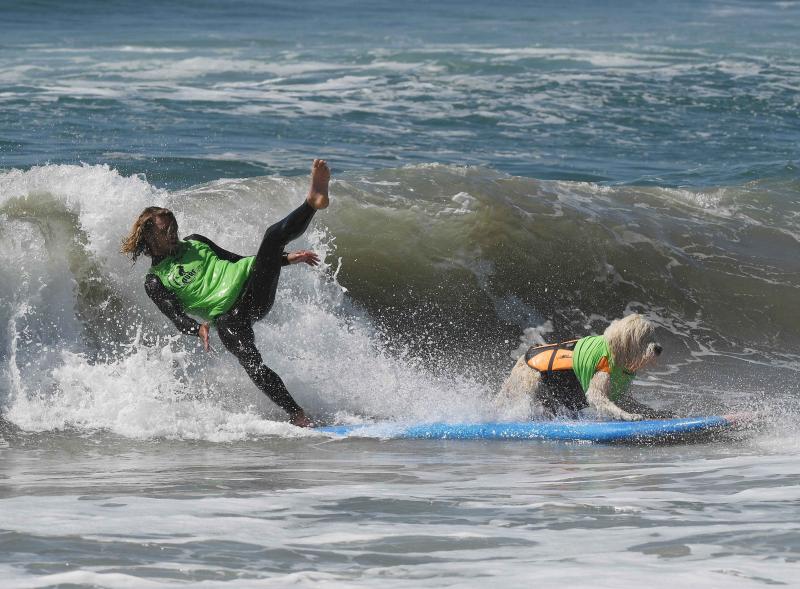 Het is de achtste keer dat de competitie georganiseerd wordt. Sommige honden trotseerden de golven alleen, anderen in tandem met hun baasje.