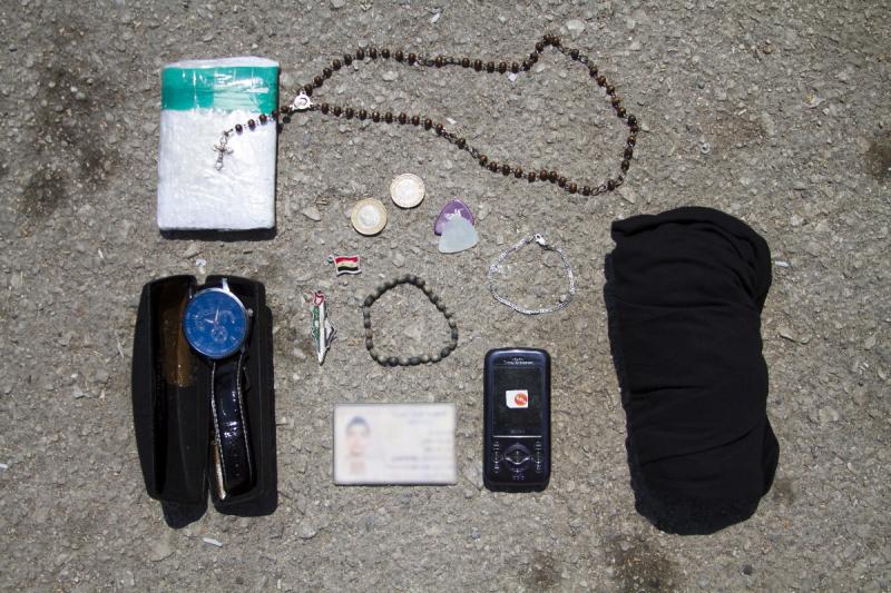 Syrische vlag, zilveren en houten armbanden (cadeaus van zijn vrienden)