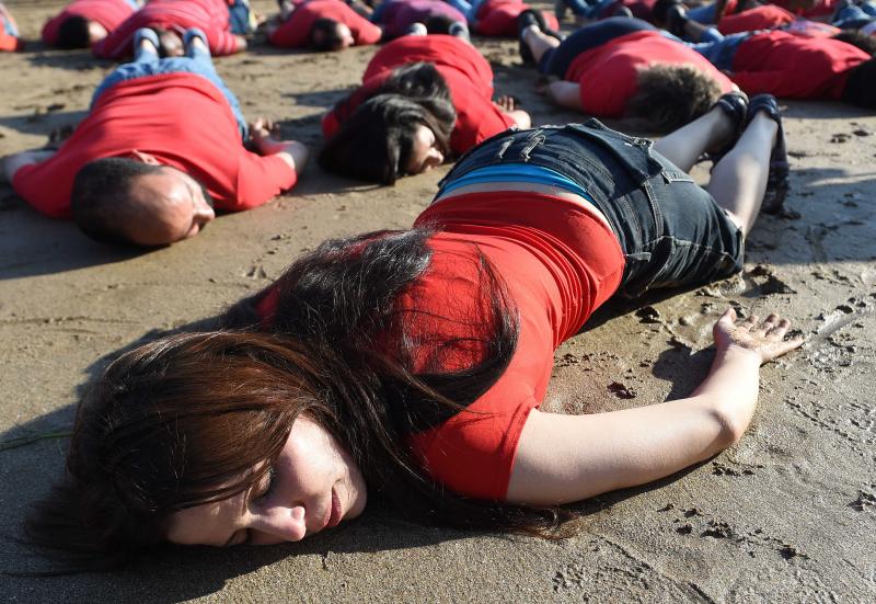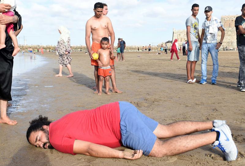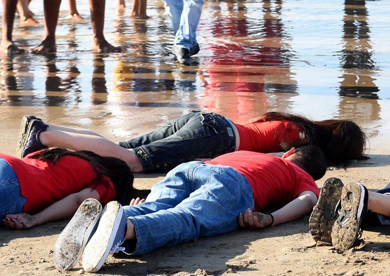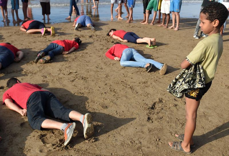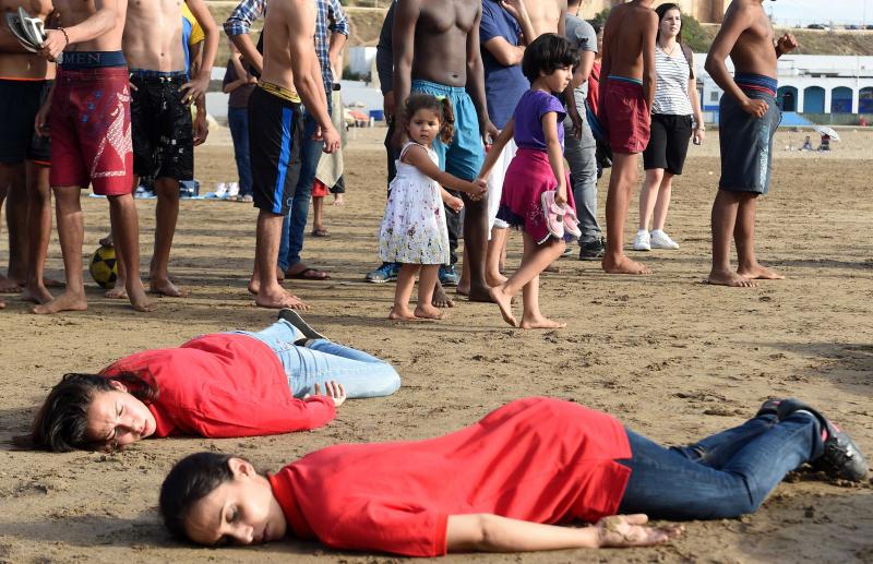 Op de treffende foto's is te zien hoe ongeveer 30 mensen roerloos en met hun gezicht in het natte zand liggen in het Marokkaanse Rabat. Ze liggen er net zo bij als Aylan. Sommigen droegen zelfs dezelfde kleding: een rode T-shirt en een blauwe broek. Als eerbetoon bleven de meeste mensen liefst 20 minuten liggen in die houding.