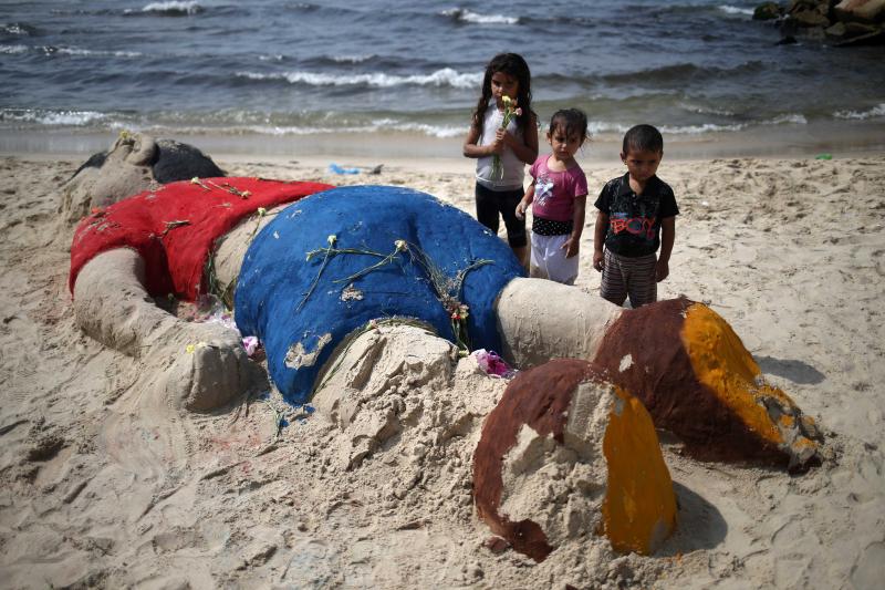 Aan de andere kant van de Middellandse zee bouwden Palestijnen een zandsculptuur van het jongetje op een strand in de Gazastrook.