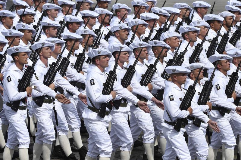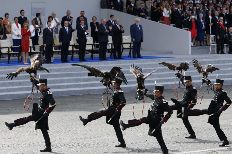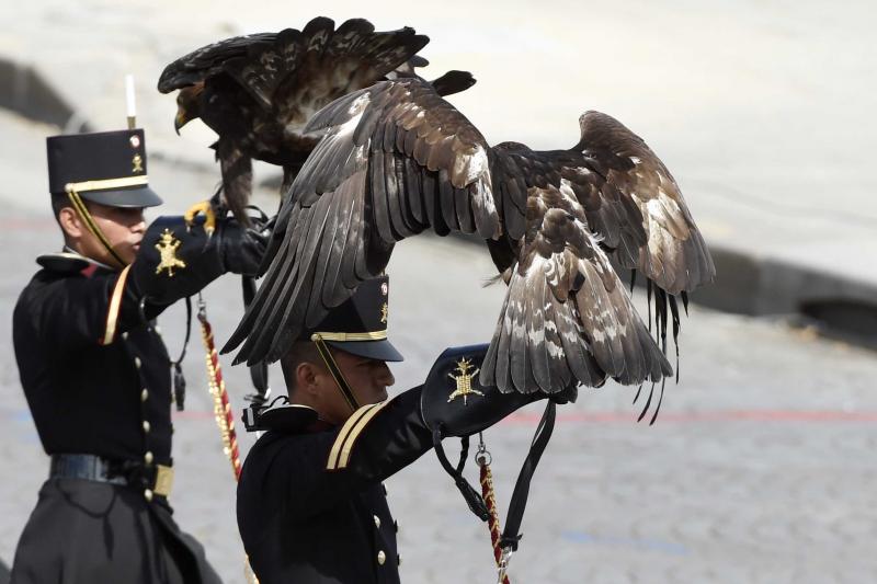 Mexicaanse troepen paraderen met valken langs de Champs-Elysées. AFP / ALAIN JOCARD