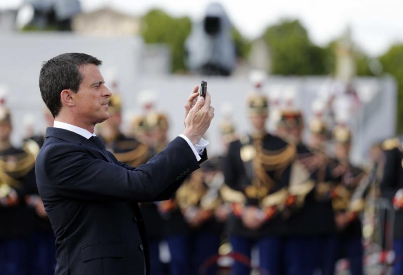 De Franse premier Manuel Valls neemt foto's van de militaire parade met zijn smartphone. AFP / Pascal Rossignol