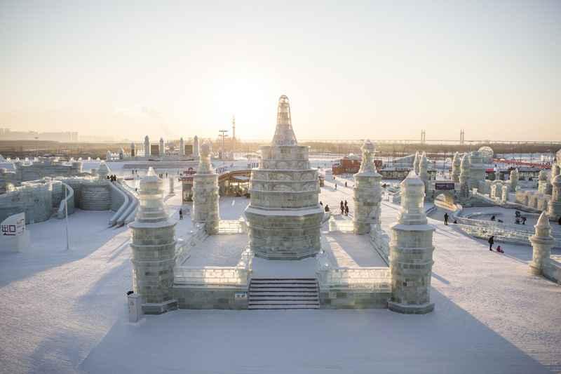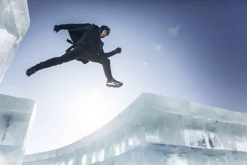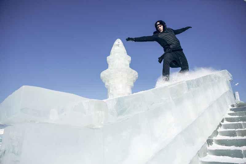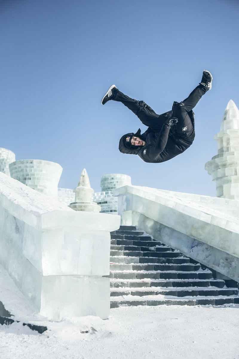 Al lopend, glijdend en springend verplaatst hij zich doorheen het spectaculaire decor. Op de achtergrond zie je een gigantisch ijspaleis.