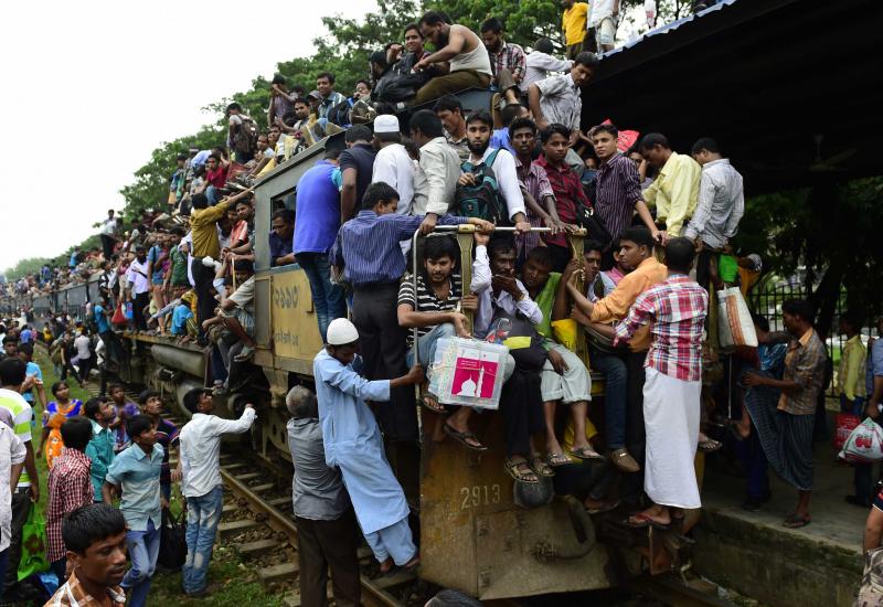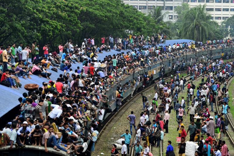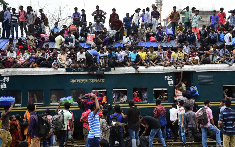 Reizigers in Dhaka, de hoofdstad van Bangladesh, proberen op een propvolle trein te geraken om terug naar hun dorpen te reizen. AFP / Munir uz ZAMAN