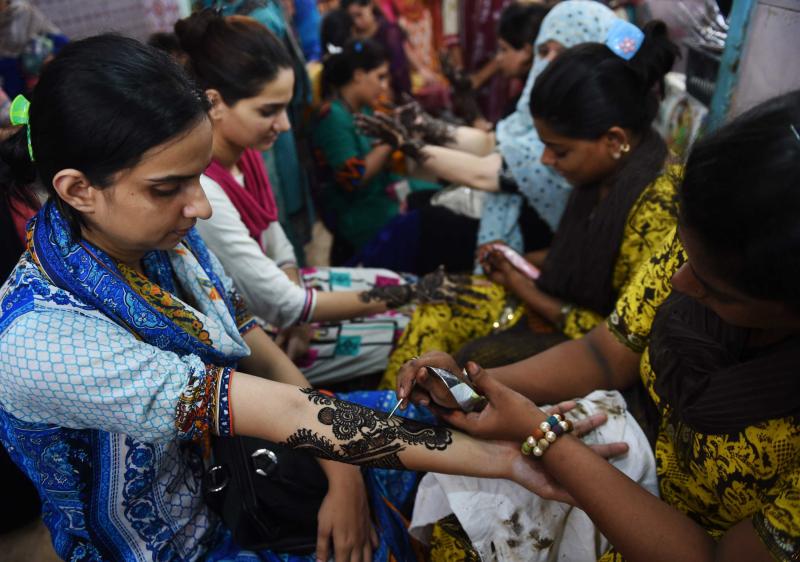Pakistaanse vrouwen laten hennatatoeages zetten in een schoonheidssalon in Karachi naar aanleiding van het Suikerfeest. AFP / Asif HASSAN