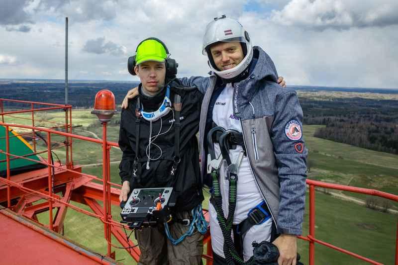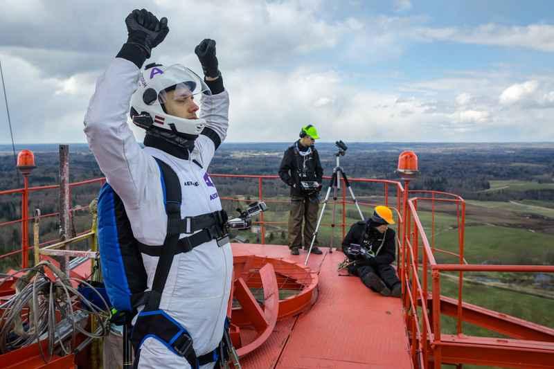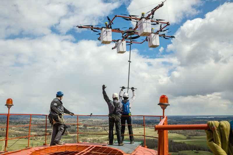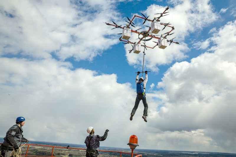 Skydiver Ingus Augstkalns wordt in het Letse Taurene tweehonderd meter de lucht ingetild door drones, om vervolgens te worden gelost. Volgens Aerones, een bedrijf dat zich specialiseert in drones die heel veel gewicht kunnen torsen, is het de eerste keer dat op die manier een sprong wordt gemaakt.