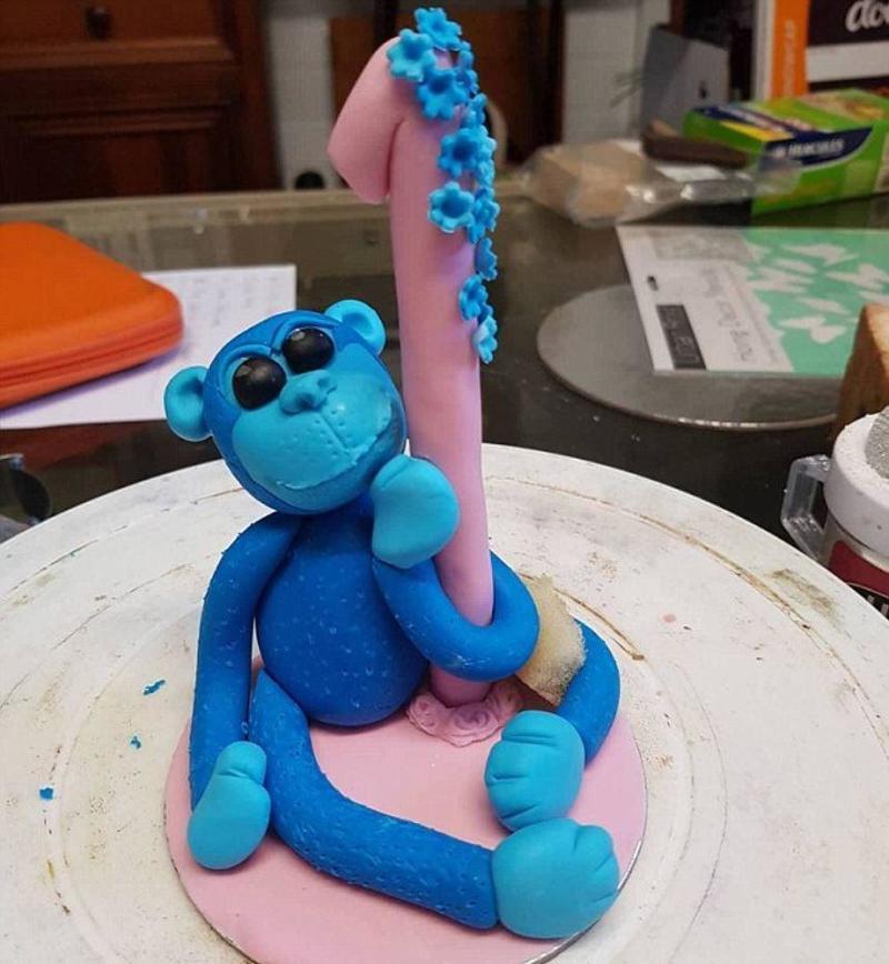 De moeder liet een taart maken met het favoriete aapje van haar dochter, en vroeg om tegelijk de leeftijd van haar spruit erin te verwerken. Net daar liep het mis. Het blauwe aapje krult zich om de statige één, maar volgens het internet heeft die rechtopstaande één iets teveel weg van één bepaald roze, mannelijke lichaamsdeel...