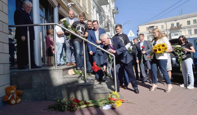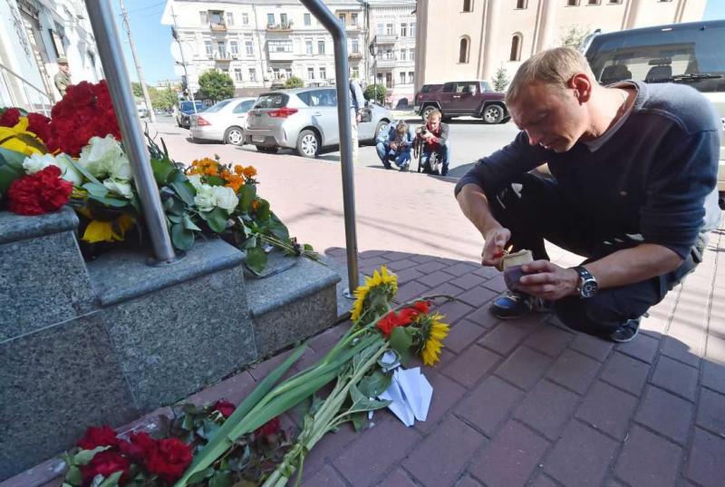 Bij het monument kregen de aanwezigen witte ballonnen om op te laten, maar er stonden ook mensen met spandoeken. "Kiev, stop met schieten", stond er te lezen.