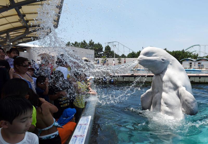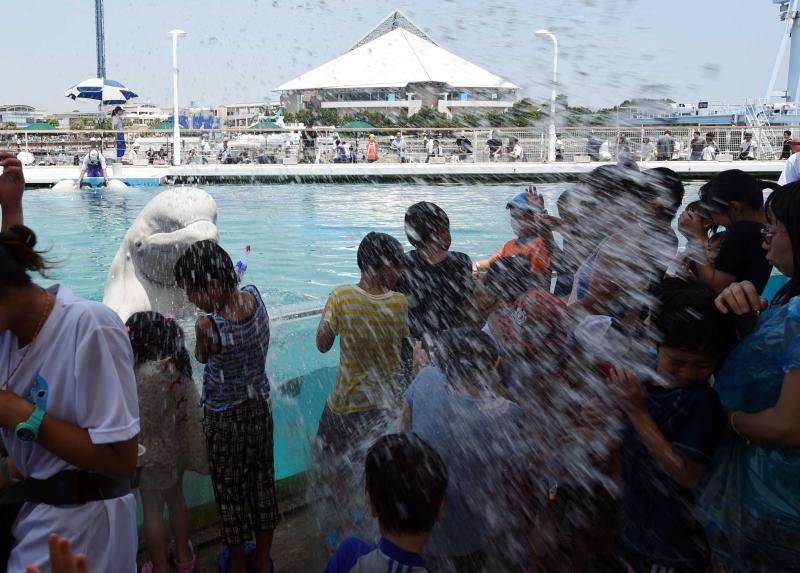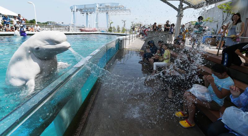 Het regenseizoen in Japan is net voorbij, en het land kampt al met temperaturen tot 34 graden Celsius. In het Hakkeijima Sea Paradise in Yokohama, nabij de hoofdstad Tokio, waren bezoekers maar wat blij toen deze witte dolfijn hen wat verkoeling bracht.
