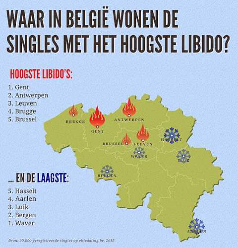 Het libido van de Walen brandt daartegen maar op een laag pitje. Waver, Bergen, Luik en Aarlen komen uit de bus als de Belgen met het minste libido.