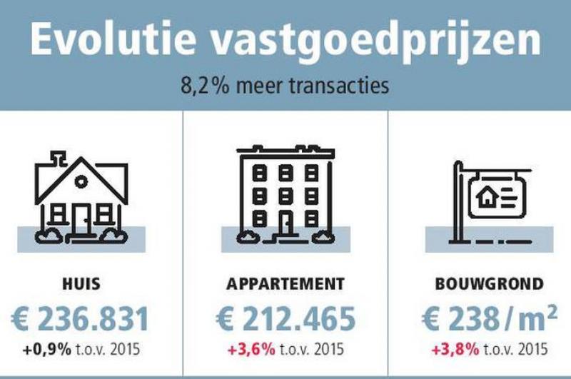 Een ander opvallend gegeven dat uit de cijfers naar voor komt is de prijsevolutie van de bouwgronden. De gemiddelde prijs van een perceel zakte naar 134.00 euro, wat 16.000 euro minder is dan 2015. Dat is te wijten aan de kleinere oppervlaktes van de percelen, want de gemiddelde prijs per vierkante meter steeg wel degelijk.