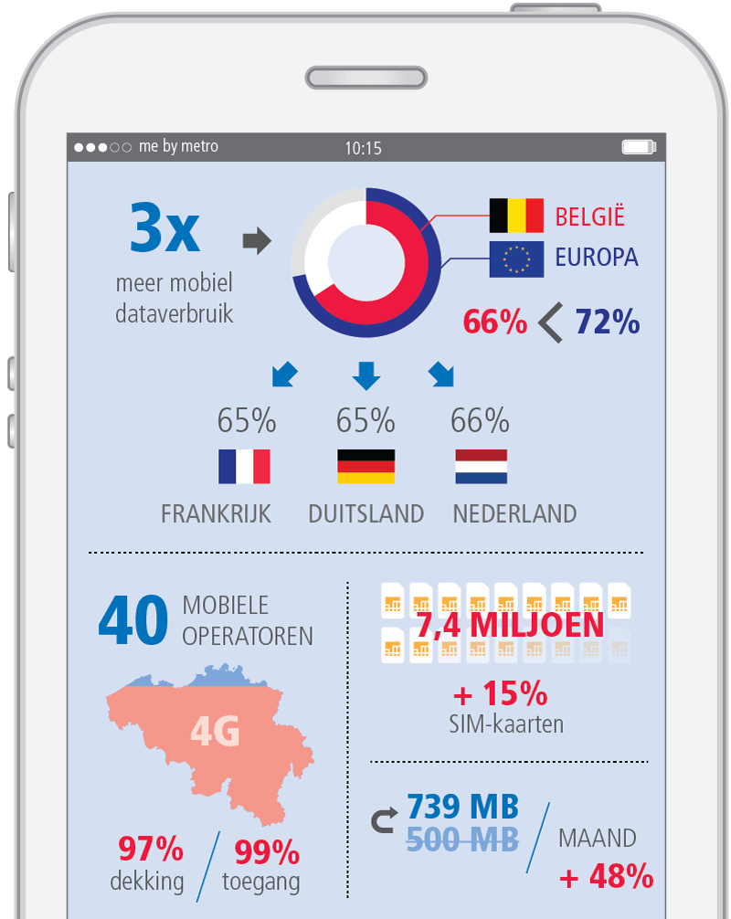 Tussen eind 2014 en begin dit jaar is in België het aantal simkaarten met een dataverbinding met meer dan 15% gestegen, van 6,4 miljoen naar 7,4 miljoen. De penetratiegraad van mobiel internet steeg zo naar 66,1%, meer dan een verdubbeling op drie jaar tijd. Dat is minder dan het Europese gemiddelde van 71,6%, maar België doet het wel beter dan buurlanden Frankrijk (64,9%), Duitsland (65,1%) en Nederland (66%).