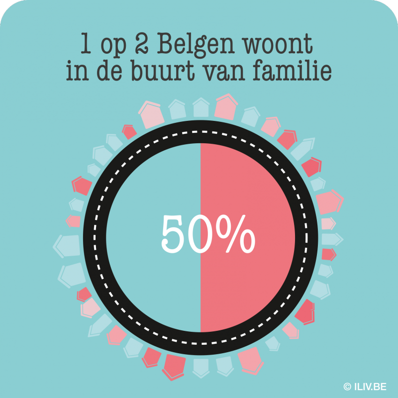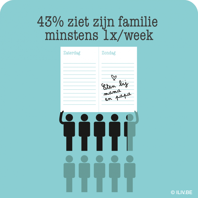 Niet alleen jongeren, ook de gemiddelde Belg gaat vaak op familiebezoek (43%). Meer nog, ongeveer de helft van de Belgen blijven vaak in de buurt van het ouderlijke nest wonen.