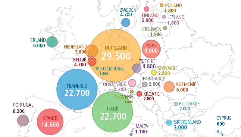 Bij de landen die het meeste asielzoekers moeten opvangen staat Duitsland (29.500) helemaal bovenaan. Eerder had bondskanselier Angela Merkel al laten weten dat ze «het beu was om alleen op te draaien voor de vluchtelingenstroom richting Europa». Frankrijk en Italië delen de tweede plaats (beiden 22.700), Spanje (14.600) vervolledigt de top drie. Verder zou ook een aantal vroegere Oostbloklanden een grotere verantwoordelijkheid krijgen.