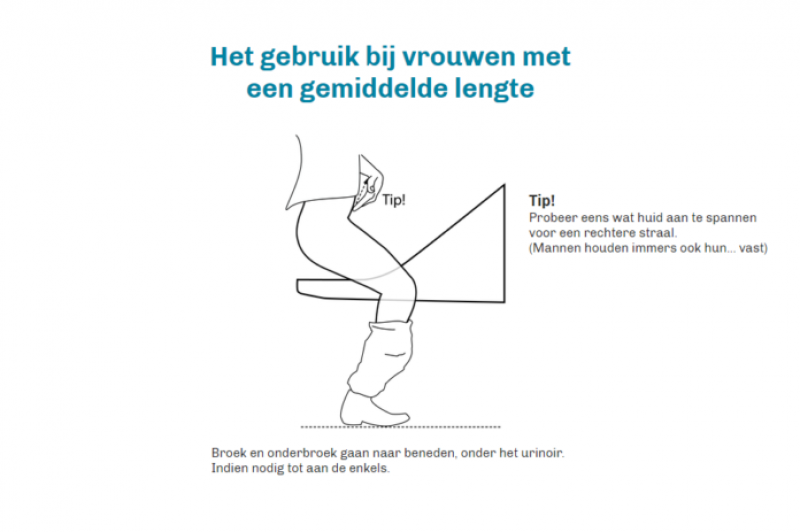 Een vrouwenurinoir klinkt misschien wat bizar, maar als we de gebruiksaanwijzing mogen geloven, is er niets ingewikkeld aan. Je doet je broek naar beneden (of je kleedje naar boven), plaatst je benen aan weerszijden naast het urinoir en schuift indien nodig wat naar voren. Vervolgens buig je je benen een beetje en dan kan je met een gerust hart je blaas legen. Opgelet: het is niet de bedoeling dat je het vrouwenurinoir aanraakt, mocht dat nog niet duidelijk zijn.