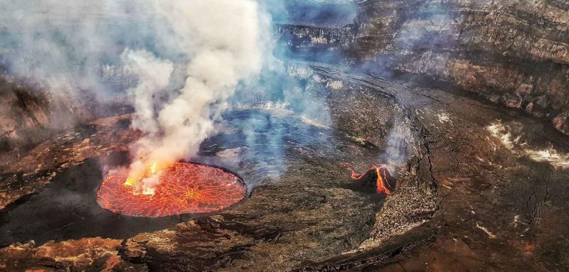 Maar hoogmoed komt voor de val, zo blijkt al snel. De harde rotsen van het laatste stuk zijn behoorlijk steil, waardoor ik pardoes op mijn bek ga. Net wanneer ik als een driejarige kleuter mijn wandelstok boos wil neergooien, krijg ik de top van de berg in het vizier. Nog eens vijf minuten later staan we met een kop thee in de hand te genieten van het uitzicht op een van de grootste actieve lavameren ter wereld. Rechts van het meer is bovendien een kleine soort minivulkaan ontstaan, die ijverig klodders lava als miniraketten de lucht in stuurt. Dit is beter dan eender welke Netflix-serie. Ik begin ei zo na in God te geloven.