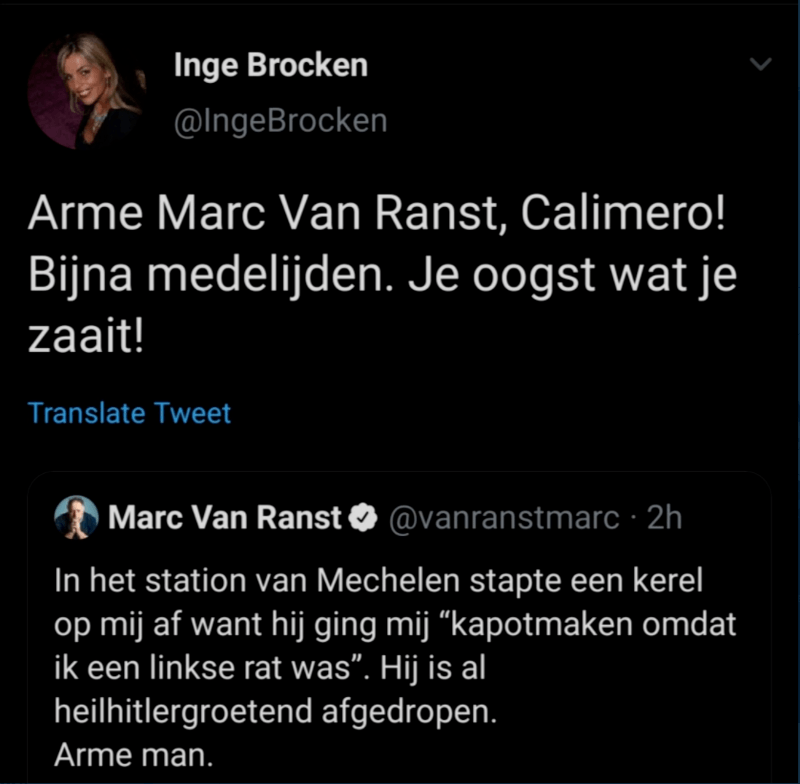 Inge Brocken, als schepen bevoegd voor onder meer Erfgoed, Dierenwelzijn en Toerisme in Beveren, oogstte zondag heel wat kritiek met een tweet aan het adres van Marc Van Ranst. De viroloog deelde een foto van een man die hem in het station van Mechelen zou hebben uitgescholden voor 'linkse rat'. Op de foto is te zien hoe de man een Hitlergroet maakt. "Arme Marc Van Ranst, Calimero", tweette Brocken daarop. "Bijna medelijden. Je oogst wat je zaait."