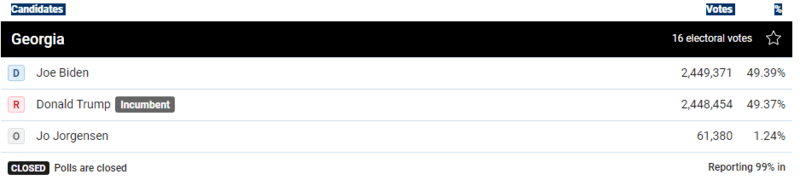 In Georgia zijn zestien kiesmannen/vrouwen te begeven. Naargelang de bron had Biden er al 253 of 264. Trump kan het zich niet veroorloven daar te verliezen, zegt CNN.