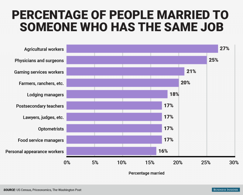 De krant sloeg de handen in elkaar met Priceonomics om data van 40 miljoen koppels te analyseren. Doel was nagaan bij welke beroepen de meeste mensen in het huwelijksbootje stappen met een collega.