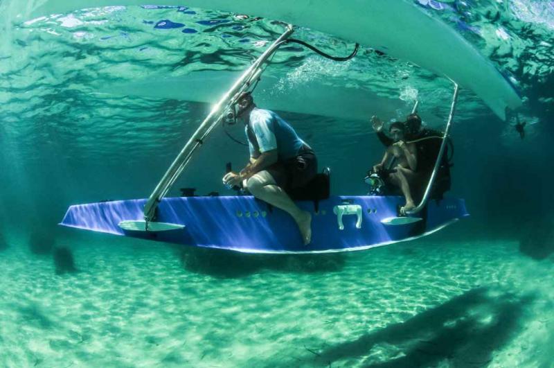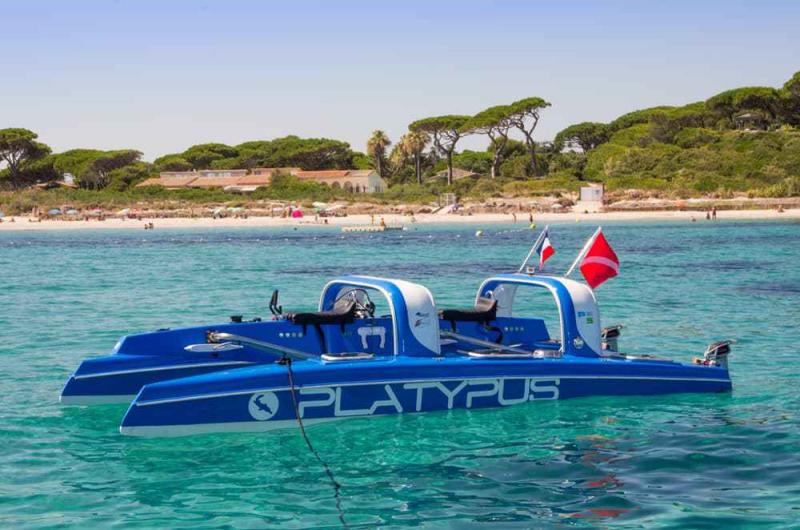 Hoe werkt het? De Platypus, Engels voor 'vogelbekdier', ziet eruit als een trimaran, een boot die bestaat uit drie langwerpige pontons. De buitenste twee pontons zorgen voor het drijfvermogen, het middenste kan tot onder de waterspiegel zakken met twee passagiers die erop zitten. Zij dragen uiteraard duikbrillen en zijn verbonden met zuurstoftanks, zodat ze lange tijd onder water kunnen blijven.